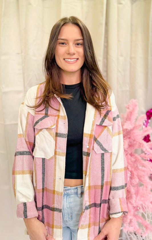 Pink plaid long sleeve button up shacket