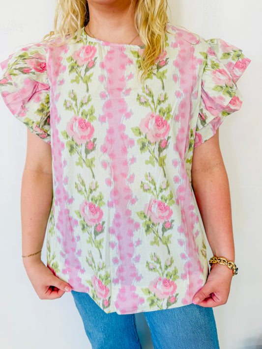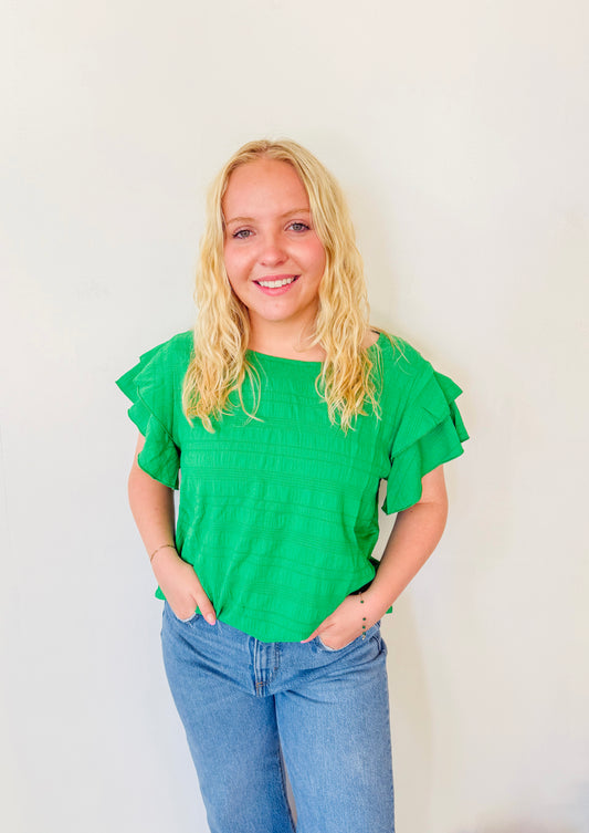 Textured Ruffled Sleeve Round Neck Top: Kelly Green