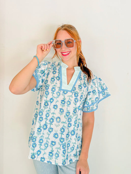 Textured Ruffled Sleeve Round Neck Top: Royal Blue