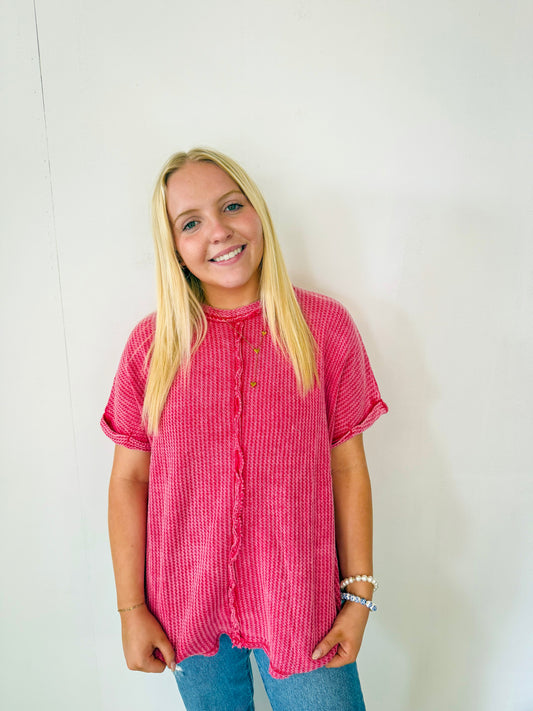 Washed Ribbed Short Sleeve Top- Hot Pink