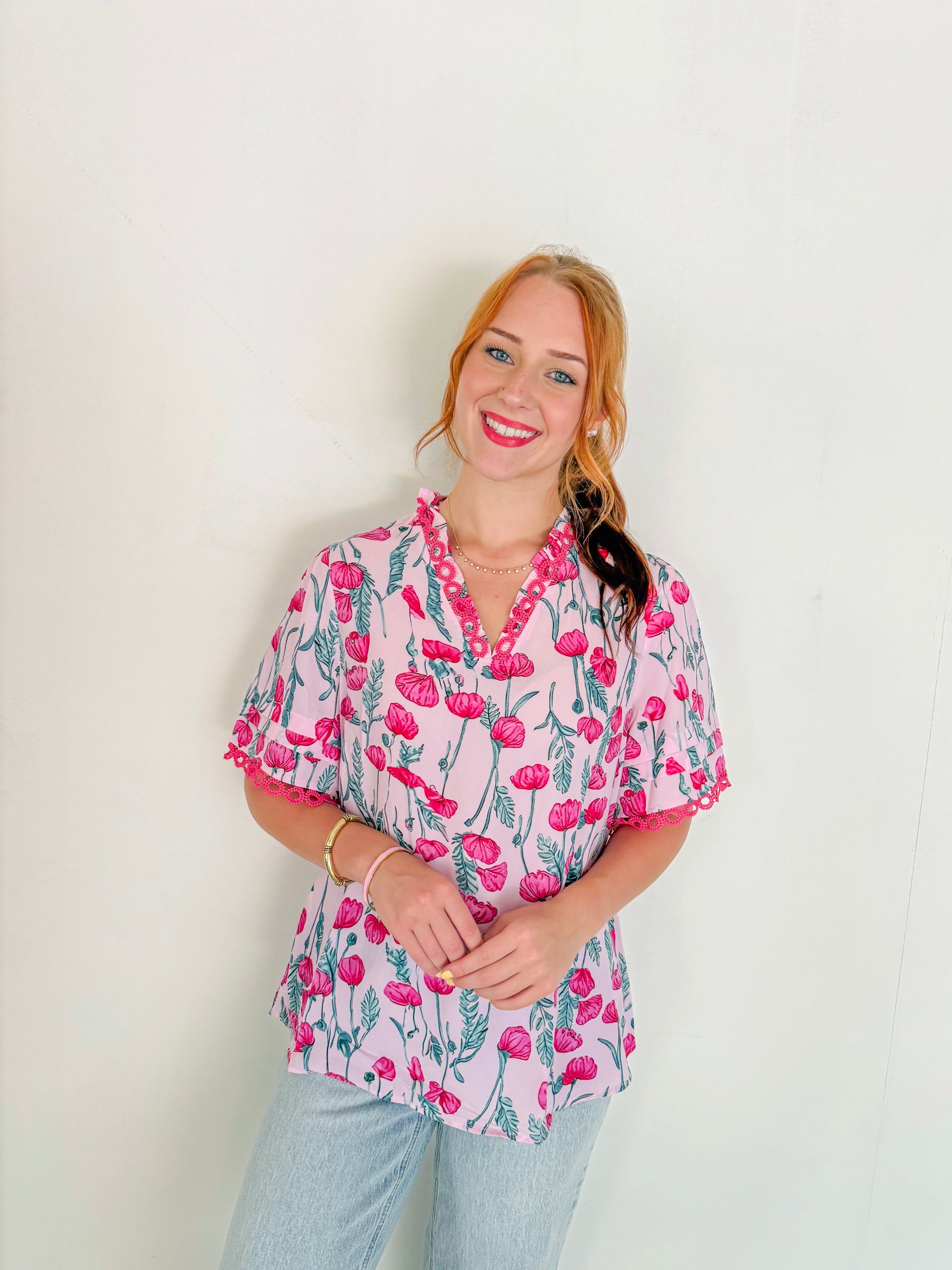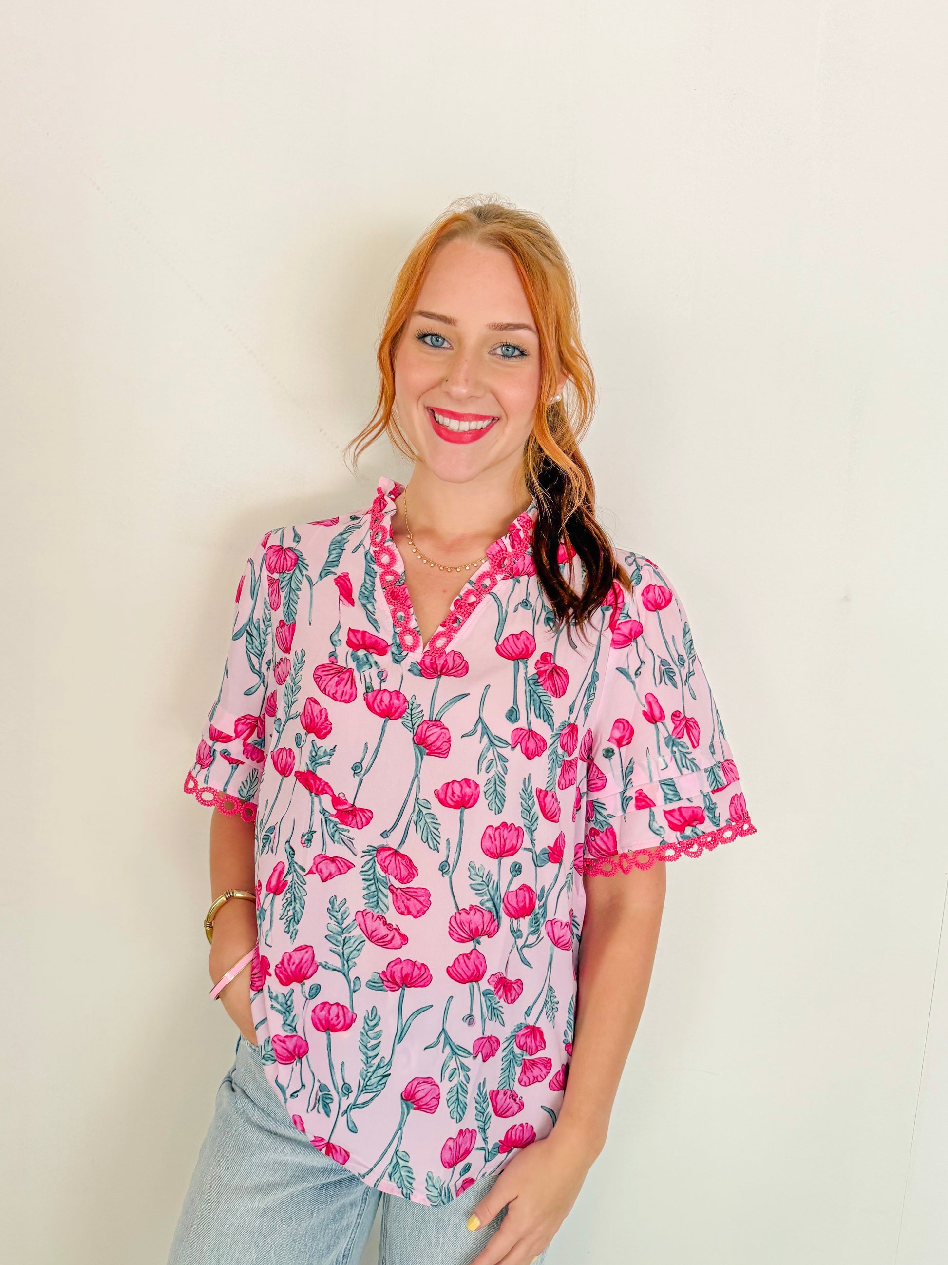 Floral Scallop V-Neck Top- Pink