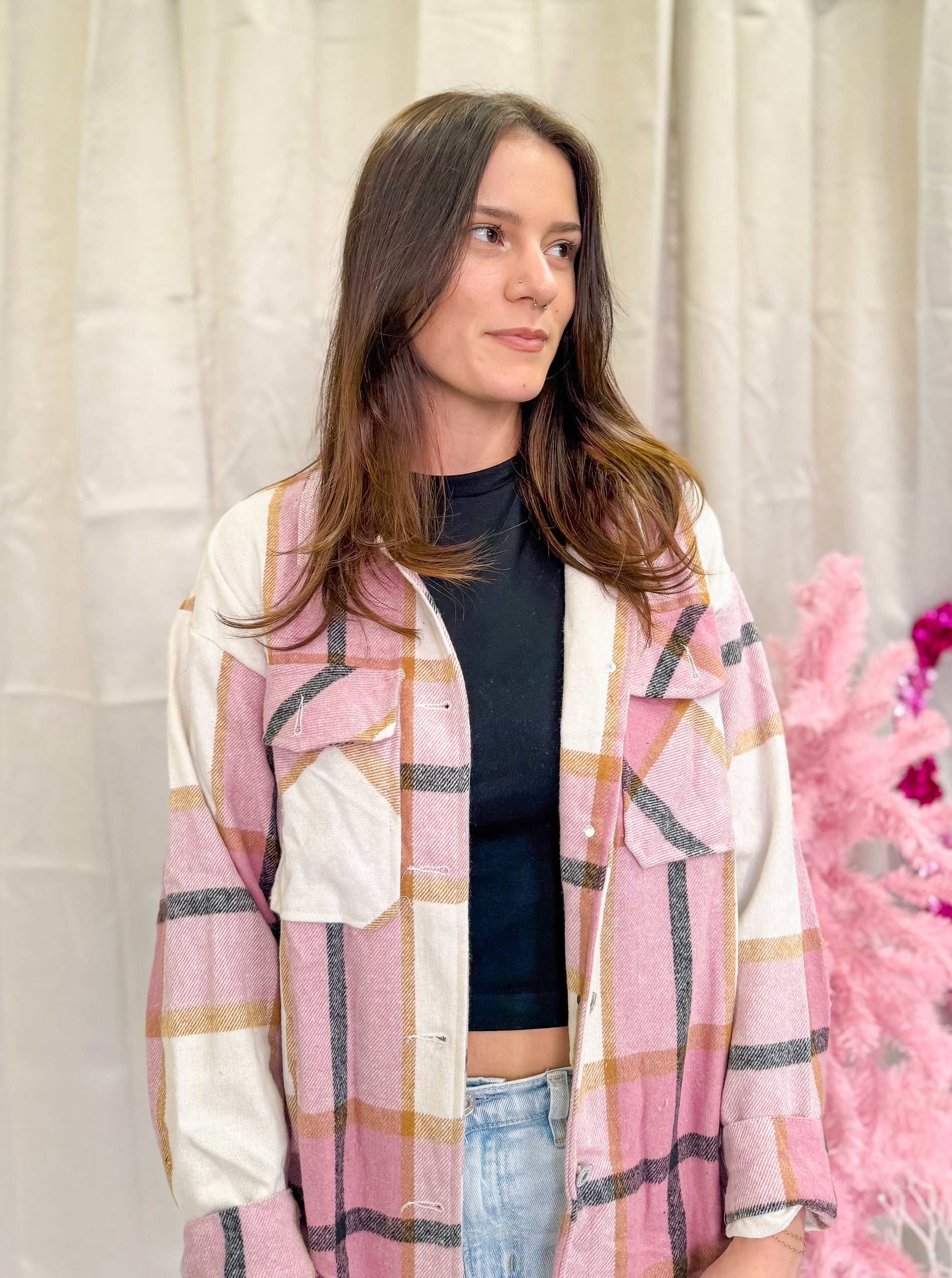 Pink plaid long sleeve button up shacket