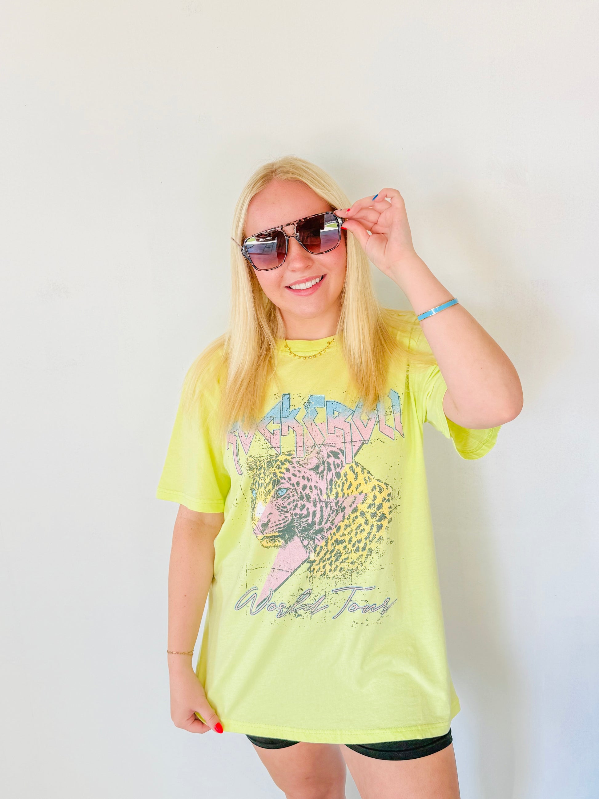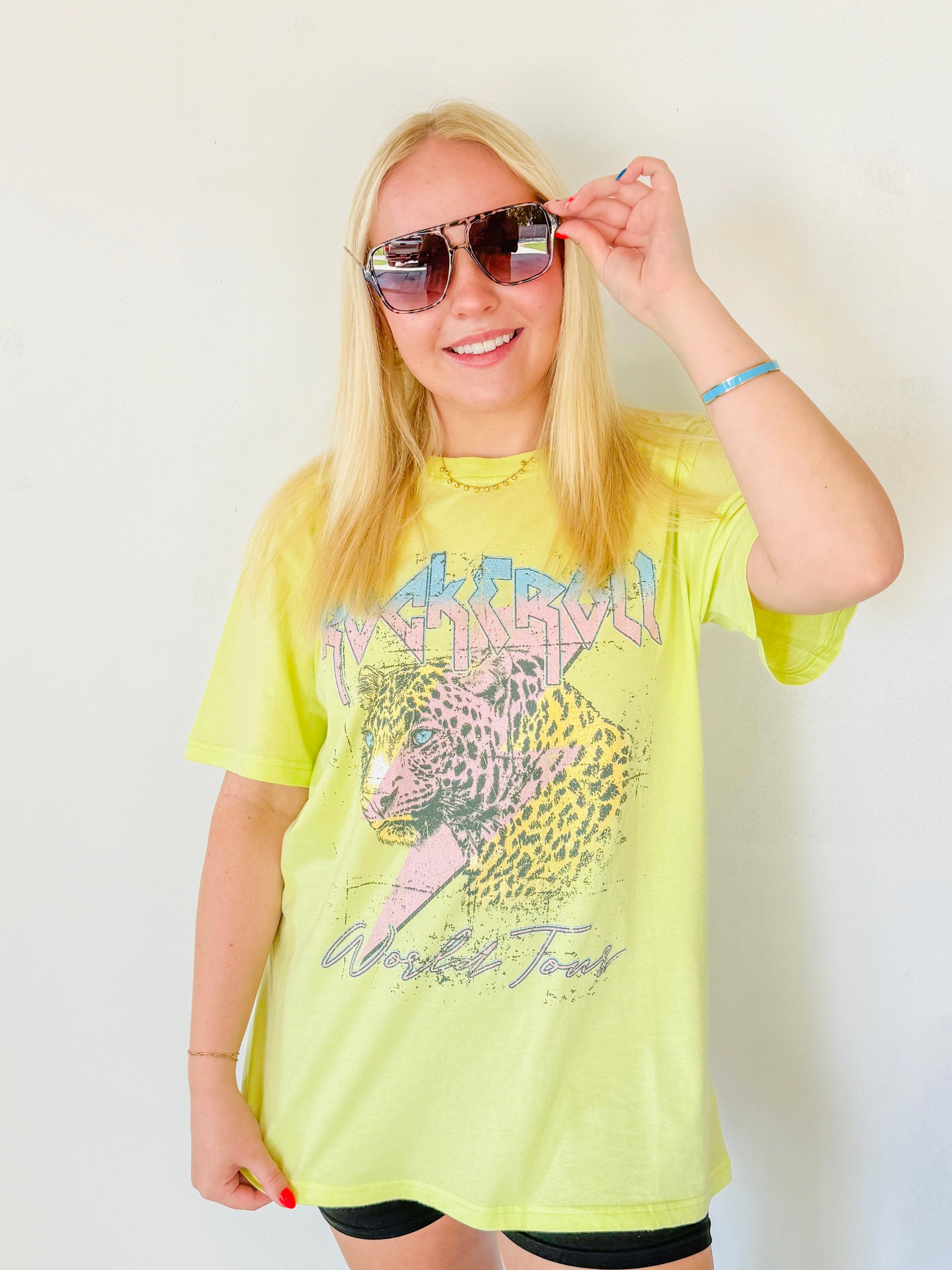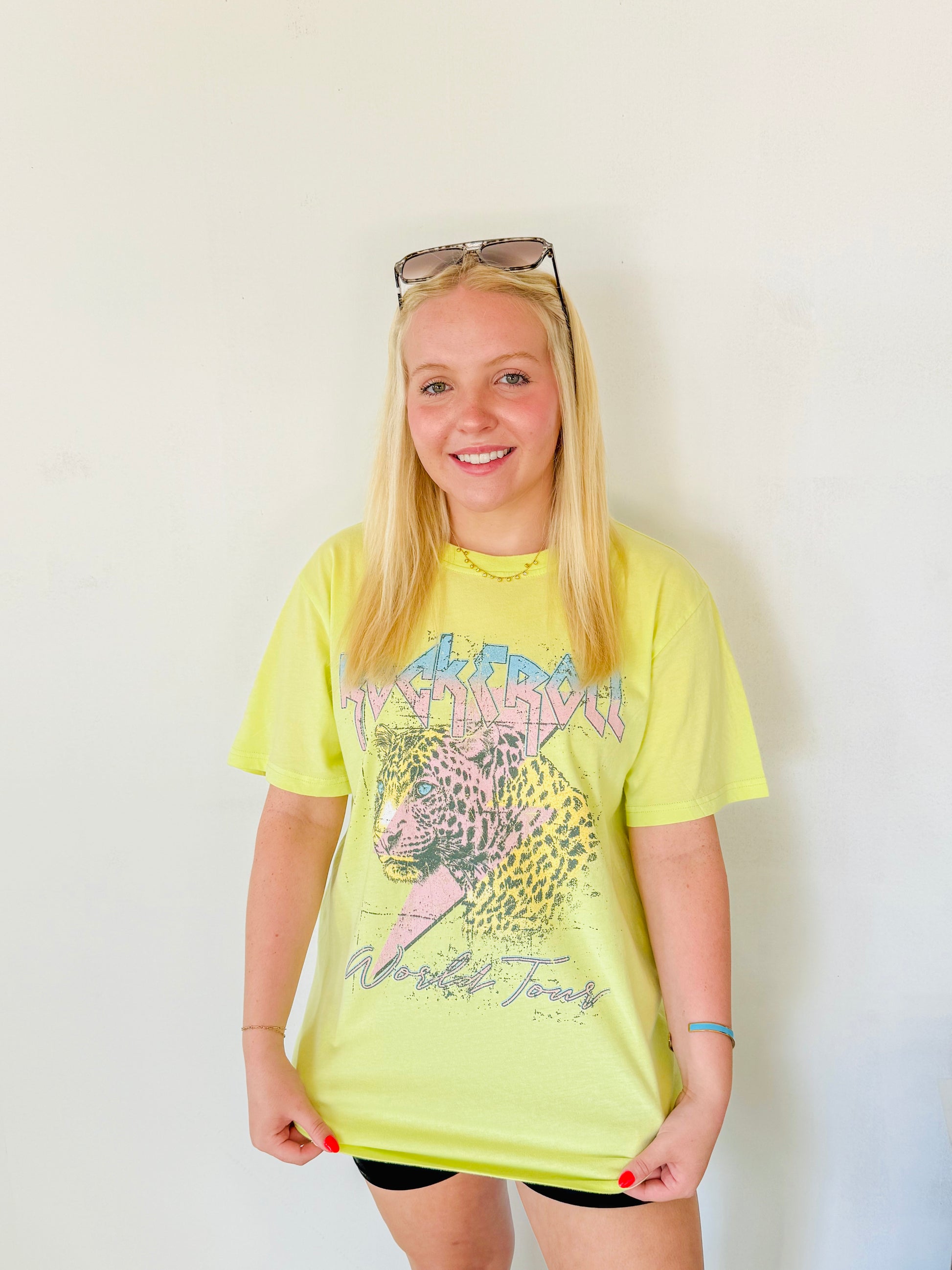 Rock N Roll Leopard Bolt Graphic Tee- Lime