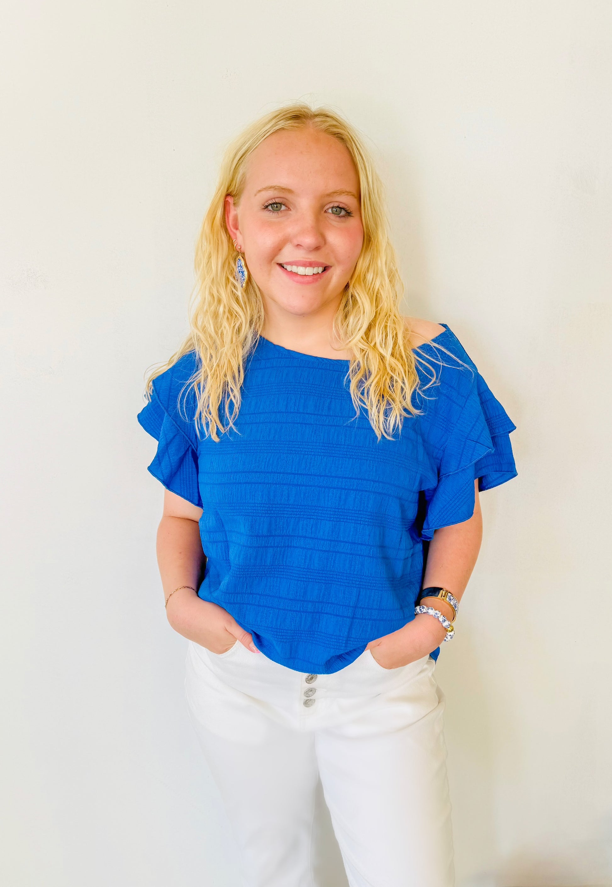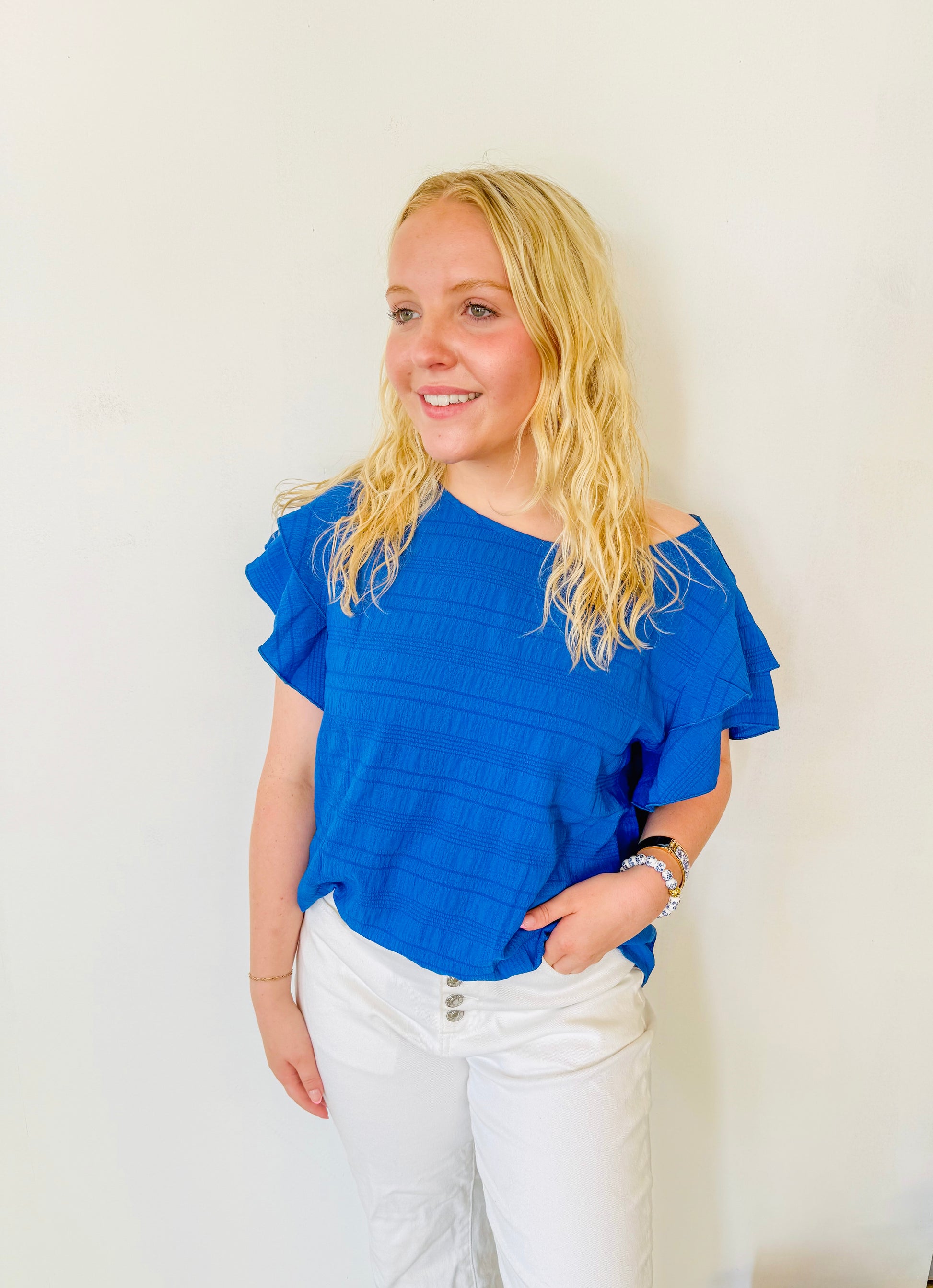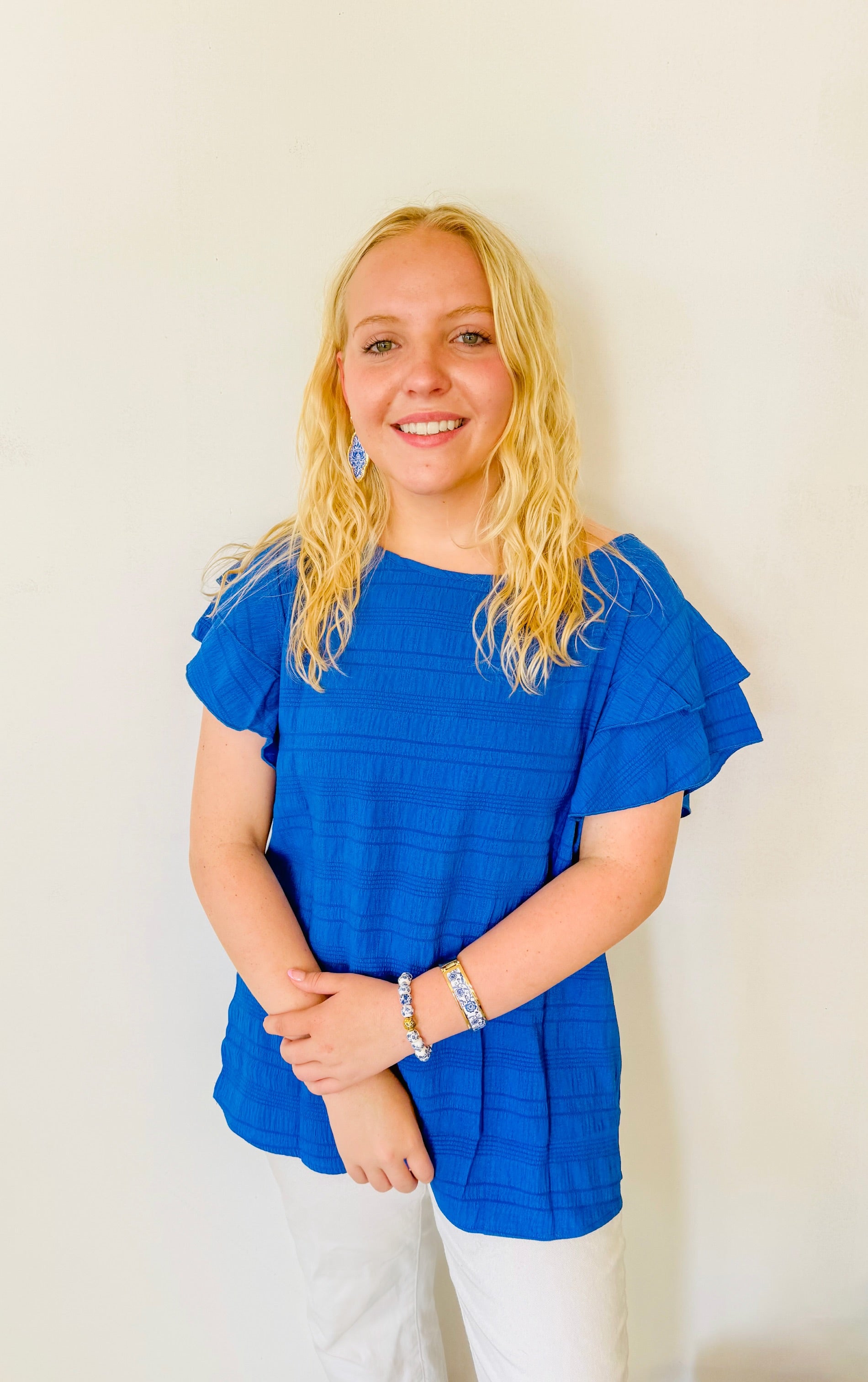 Textured Ruffled Sleeve Round Neck Top: Royal Blue
