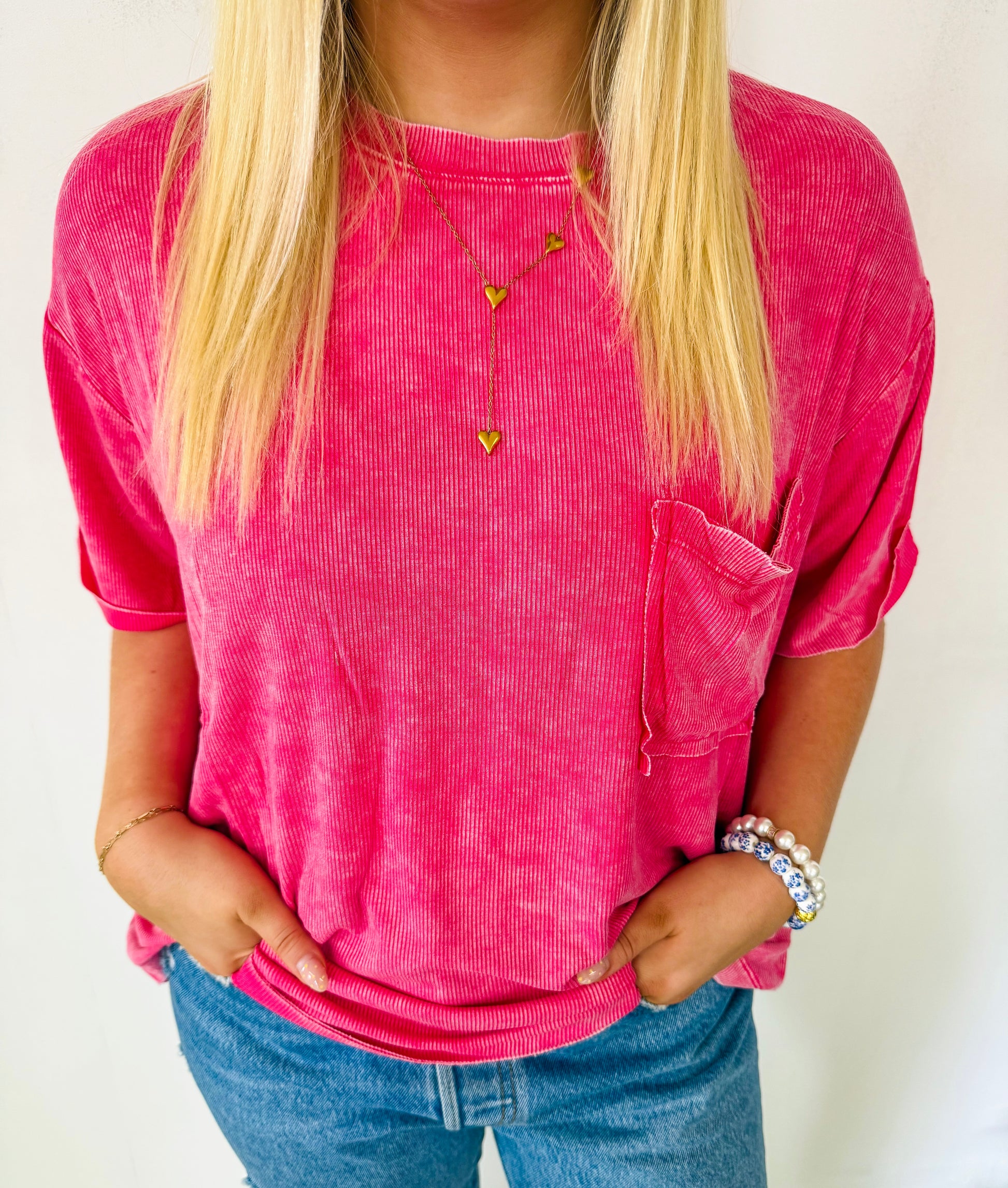 Washed Ribbed Short Sleeve Top- Hot Pink